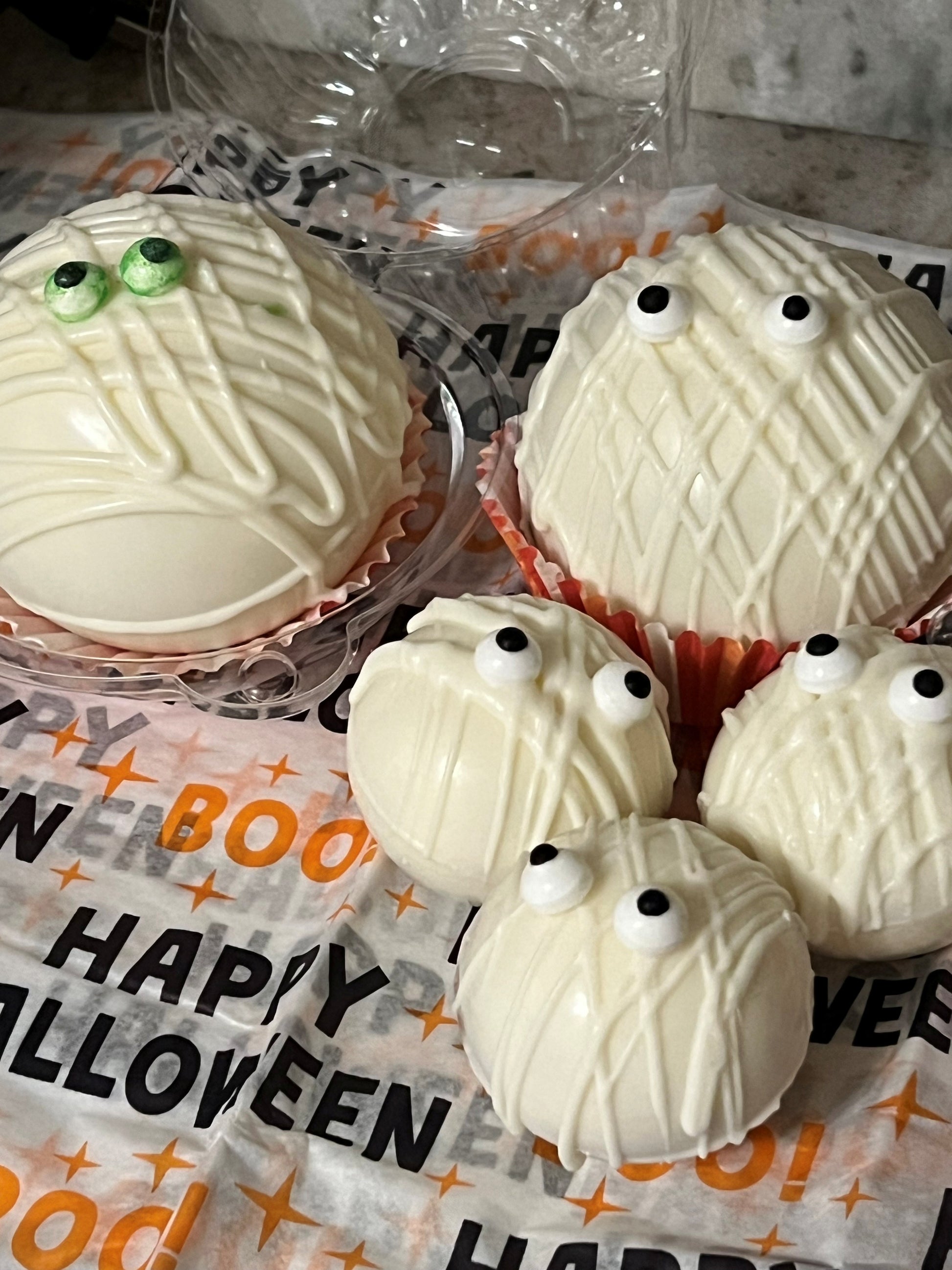 Unwrap the spooky sweetness with our Mummy Chocolate Bombs! Available in both large (2) and (3) small bomb is wrapped in white chocolate “bandages” and filled with rich cocoa mix and marshmallow surprises. Just drop into hot milk and watch your mummy melt into a deliciously creamy treat. Perfect for Halloween parties, cozy nights, or gifting to your favorite little monsters!